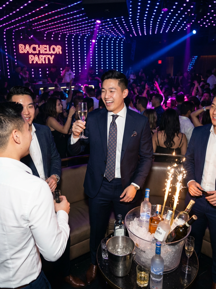 model at bachelor party club VIP section, bottle service, party atmosphere, sharp outfit, nightlife scene