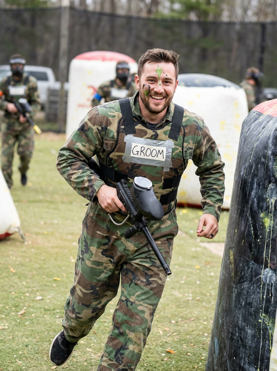 model at bachelor party paintball or go-karts, action activity, competitive fun, adrenaline moment