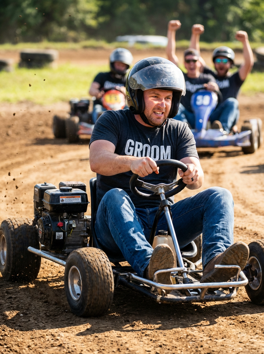 model at bachelor party paintball or go-karts, action activity, competitive fun, adrenaline moment