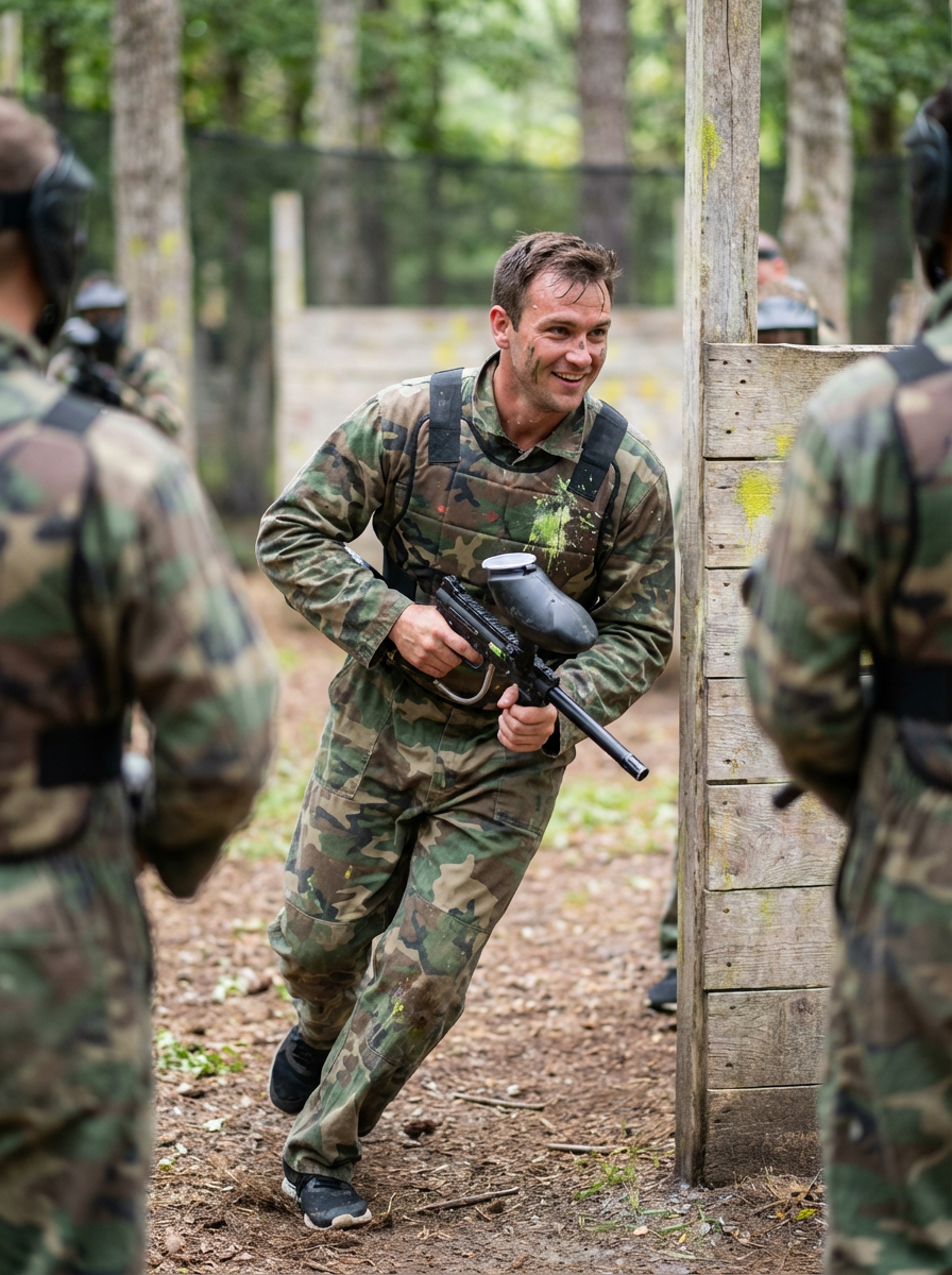 model at bachelor party paintball or go-karts, action activity, competitive fun, adrenaline moment