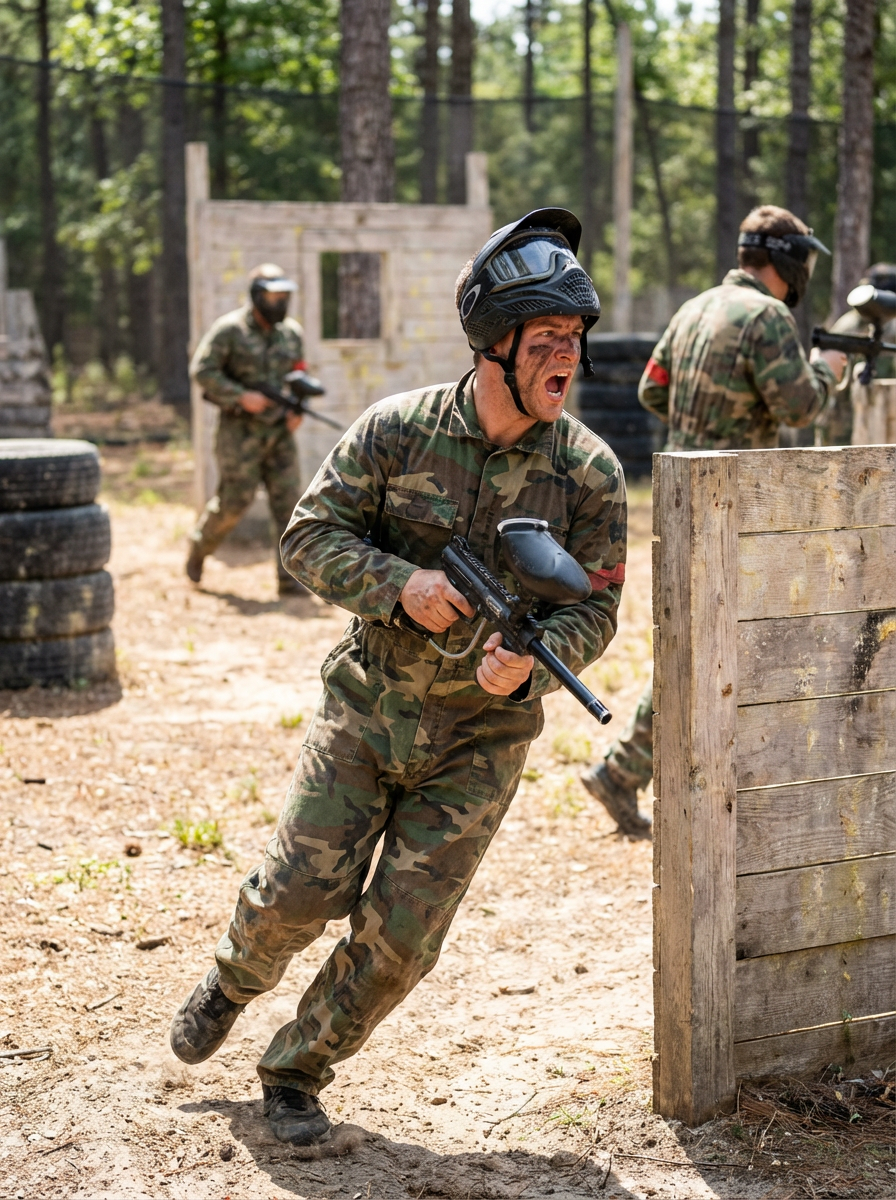 model at bachelor party paintball or go-karts, action activity, competitive fun, adrenaline moment