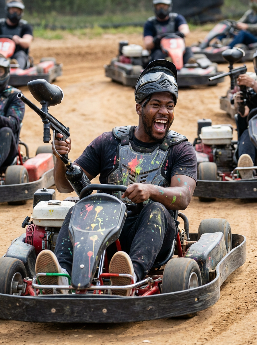 model at bachelor party paintball or go-karts, action activity, competitive fun, adrenaline moment