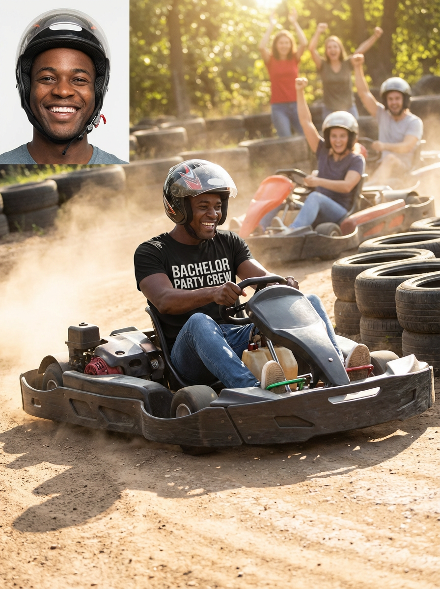 model at bachelor party paintball or go-karts, action activity, competitive fun, adrenaline moment