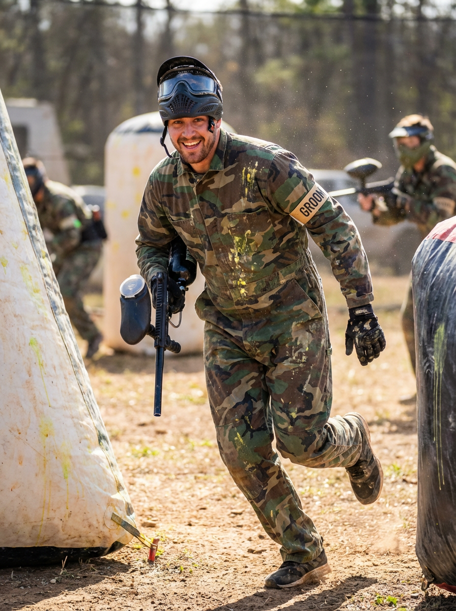 model at bachelor party paintball or go-karts, action activity, competitive fun, adrenaline moment