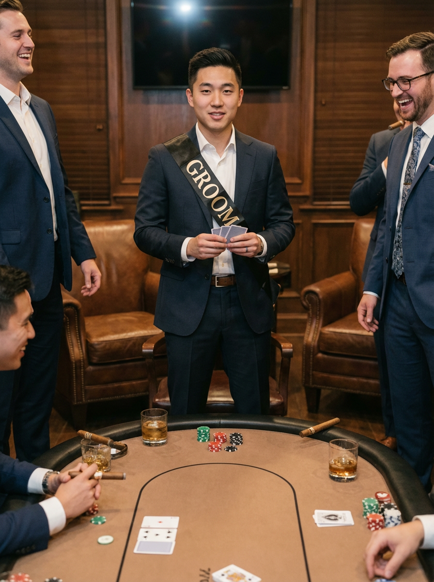 model at bachelor party poker night, cards and chips on table, cigar lounge vibe, sophisticated guys night