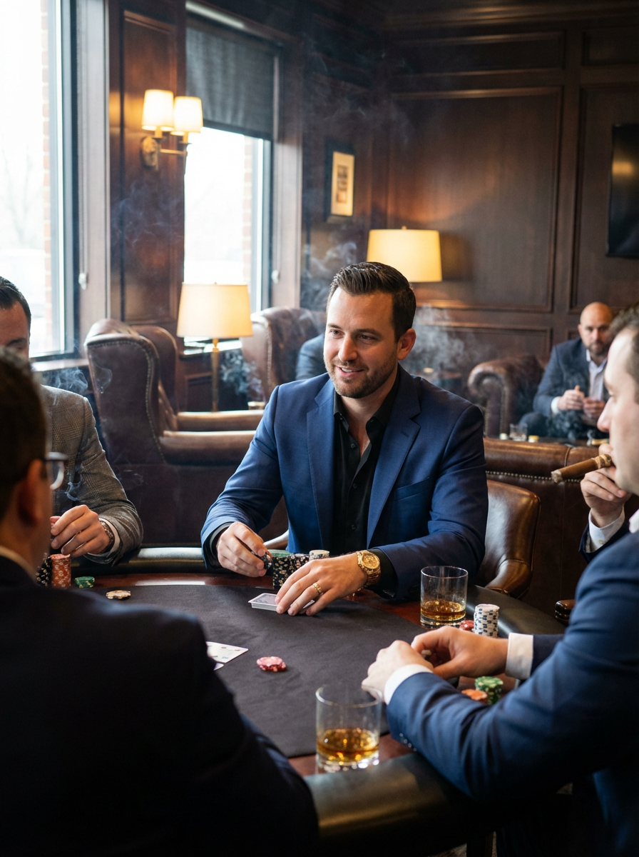 model at bachelor party poker night, cards and chips on table, cigar lounge vibe, sophisticated guys night