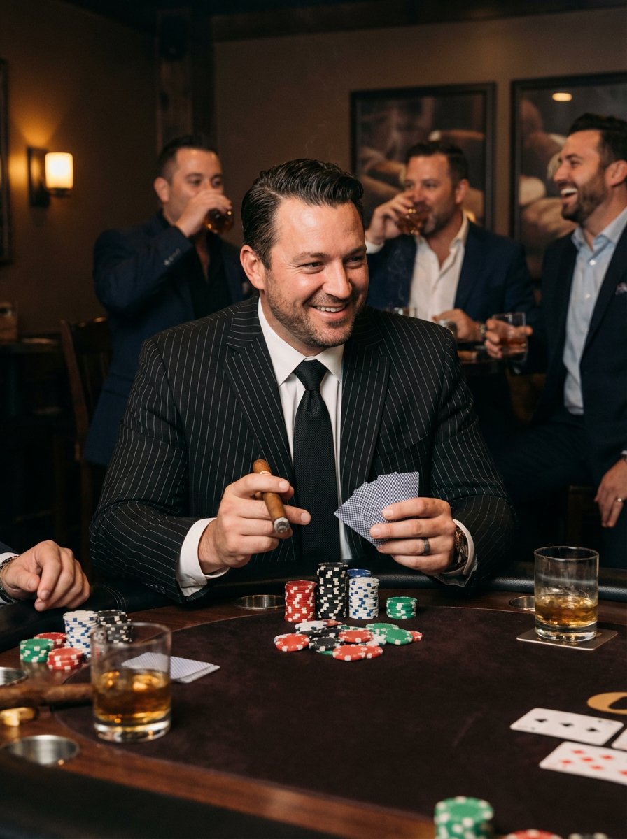 model at bachelor party poker night, cards and chips on table, cigar lounge vibe, sophisticated guys night