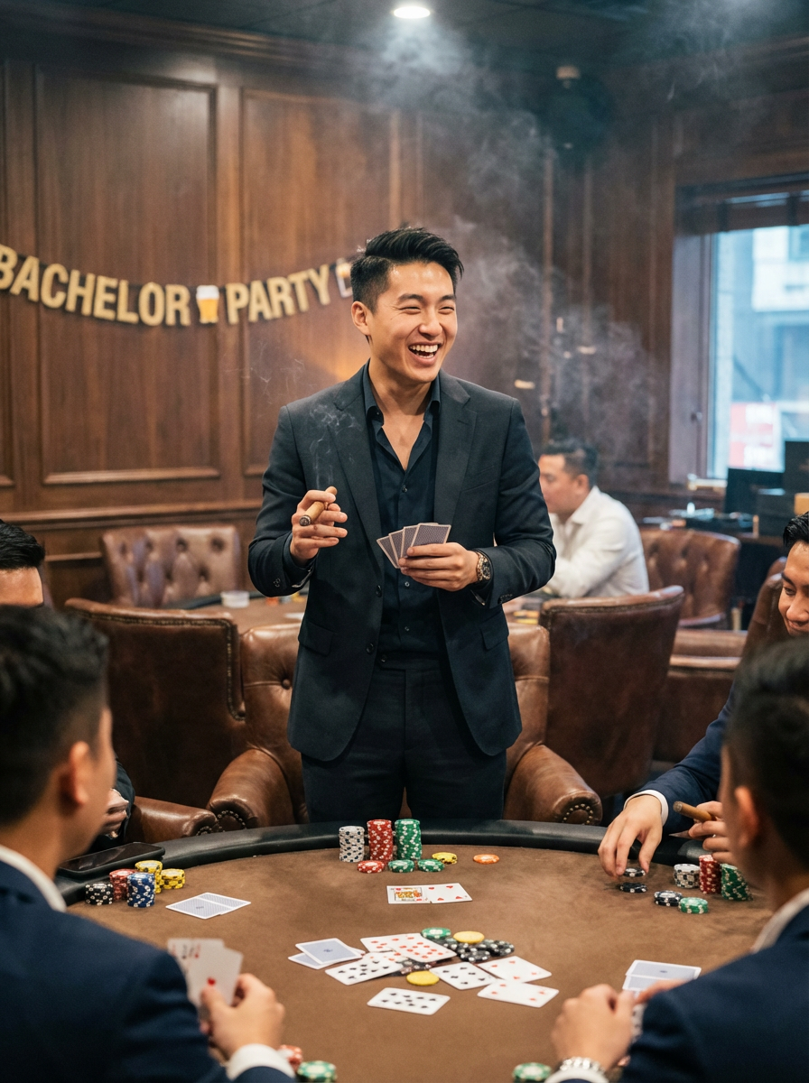 model at bachelor party poker night, cards and chips on table, cigar lounge vibe, sophisticated guys night
