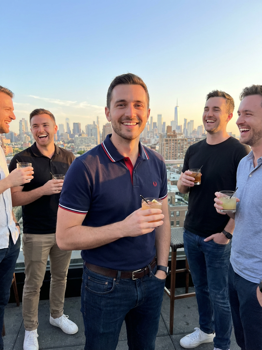 model at bachelor party rooftop bar, city skyline, cocktails with the boys, smart casual style, sunset