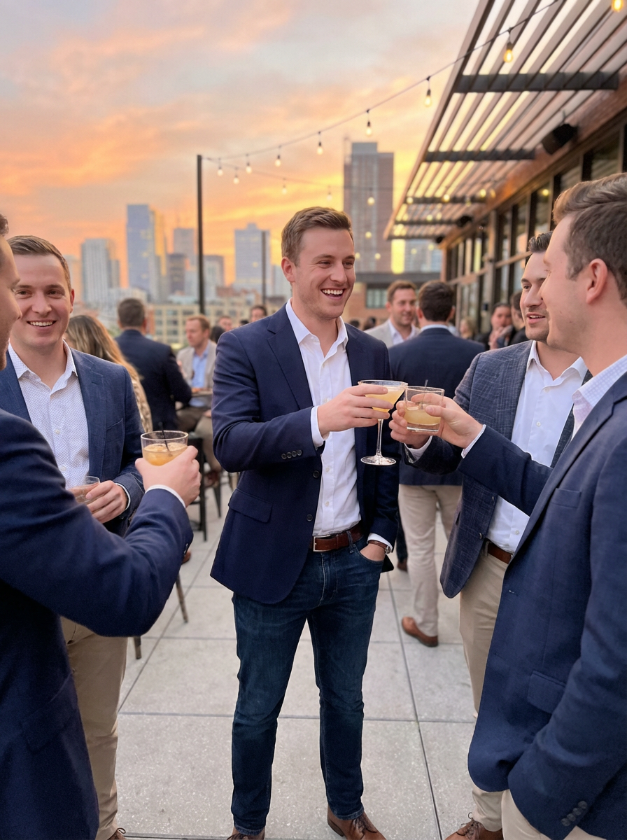 model at bachelor party rooftop bar, city skyline, cocktails with the boys, smart casual style, sunset