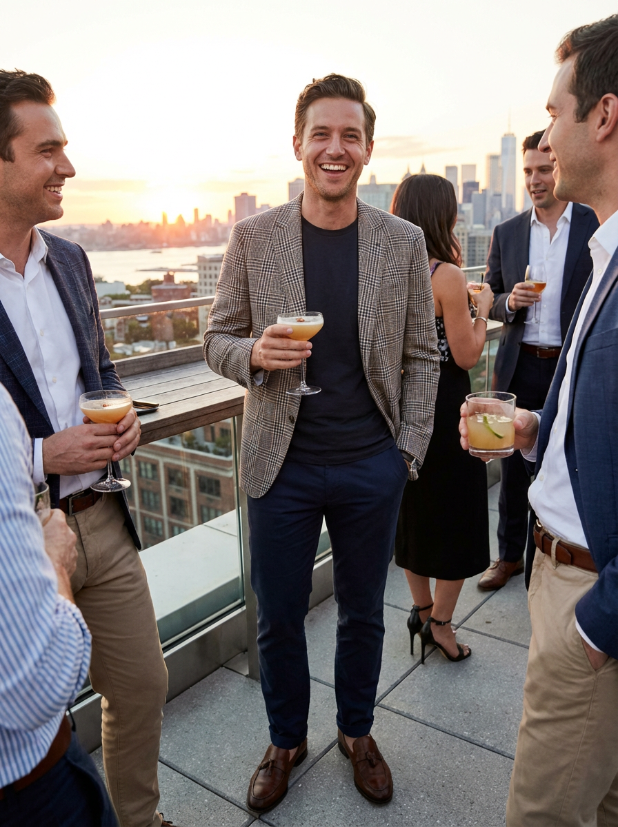 model at bachelor party rooftop bar, city skyline, cocktails with the boys, smart casual style, sunset