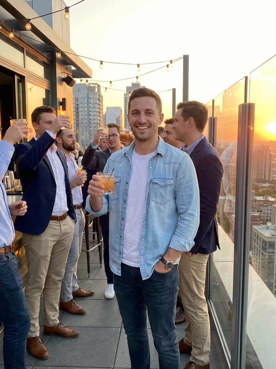 model at bachelor party rooftop bar, city skyline, cocktails with the boys, smart casual style, sunset