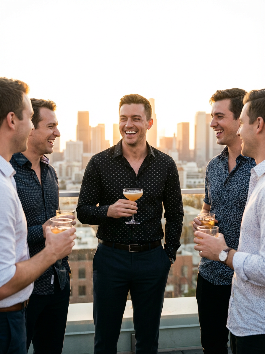 model at bachelor party rooftop bar, city skyline, cocktails with the boys, smart casual style, sunset