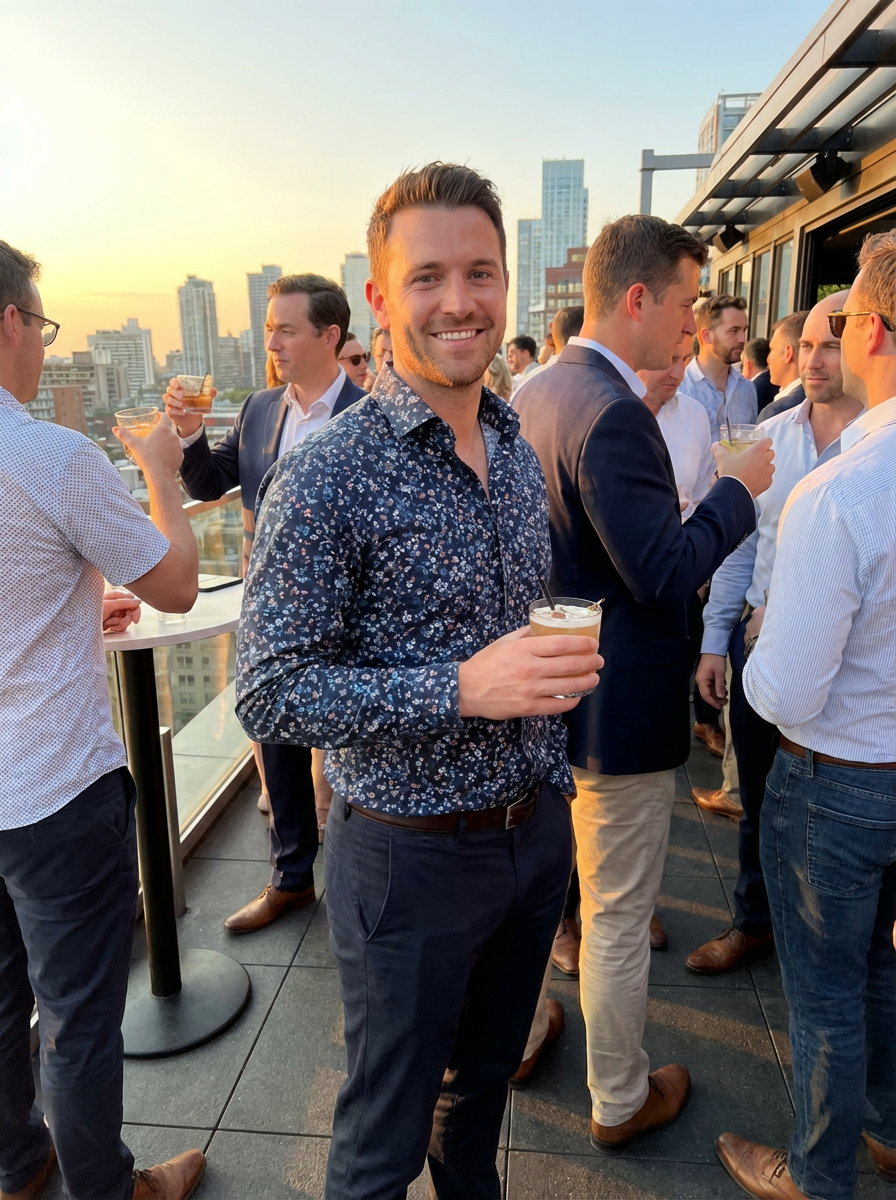model at bachelor party rooftop bar, city skyline, cocktails with the boys, smart casual style, sunset