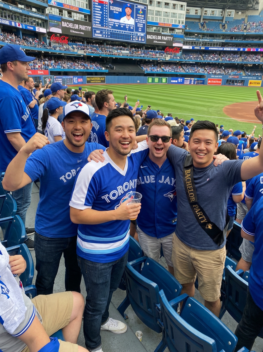 model at bachelor party sports event, stadium setting, team jersey or casual wear, cheering with friends
