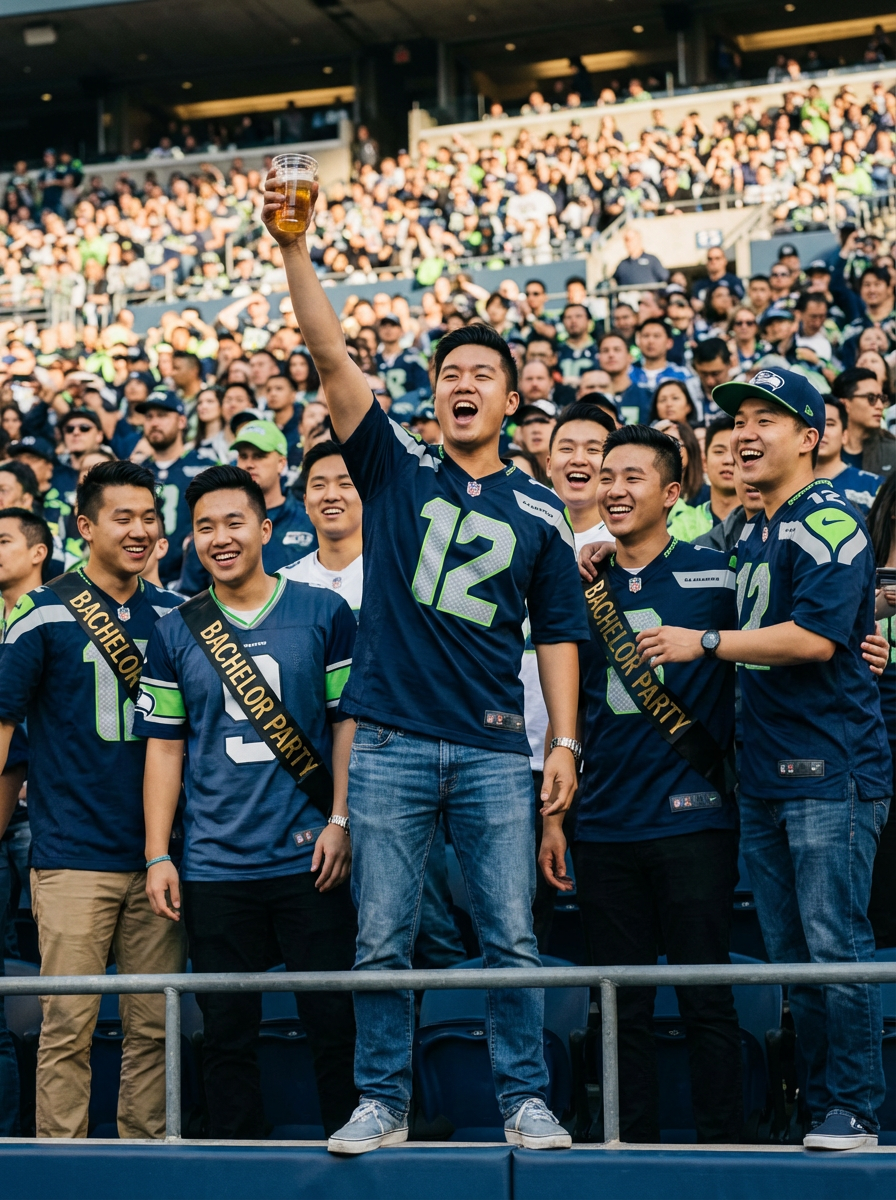 model at bachelor party sports event, stadium setting, team jersey or casual wear, cheering with friends