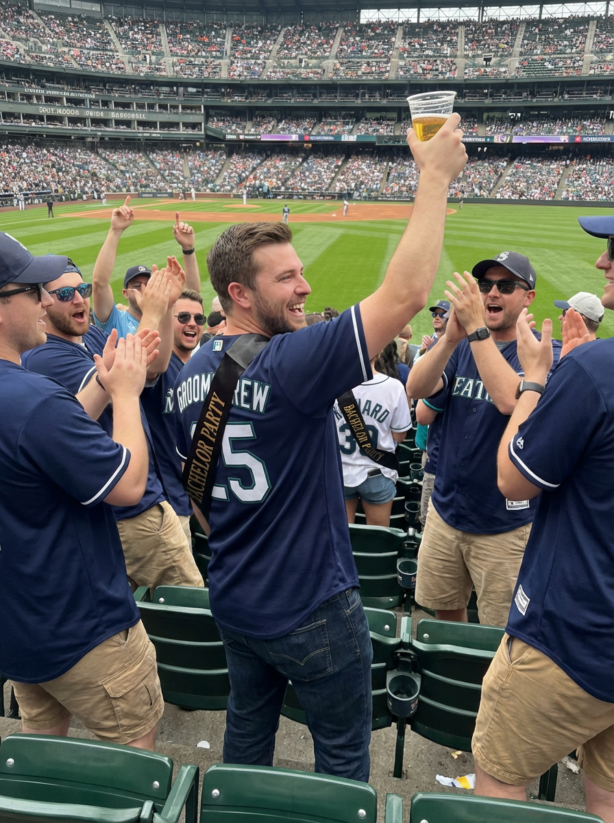 model at bachelor party sports event, stadium setting, team jersey or casual wear, cheering with friends
