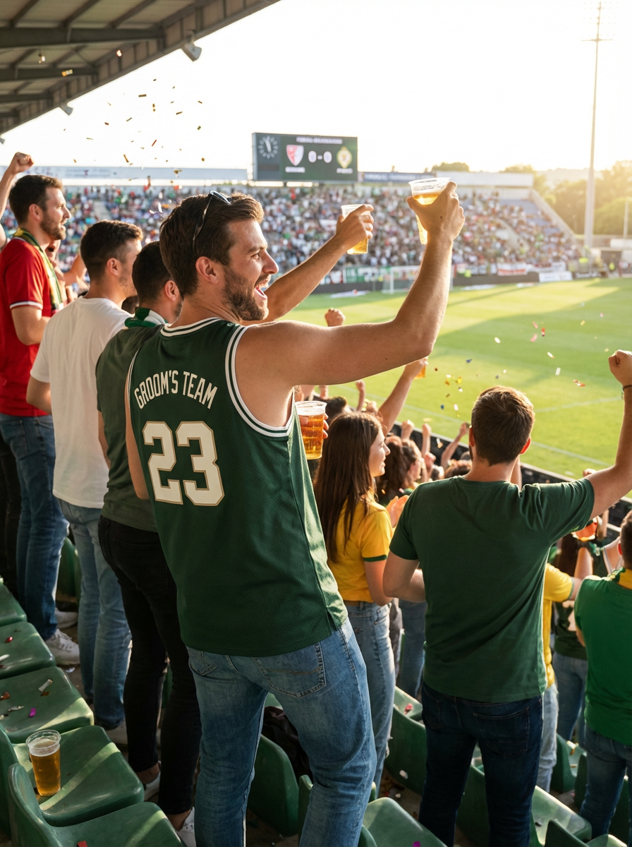 model at bachelor party sports event, stadium setting, team jersey or casual wear, cheering with friends