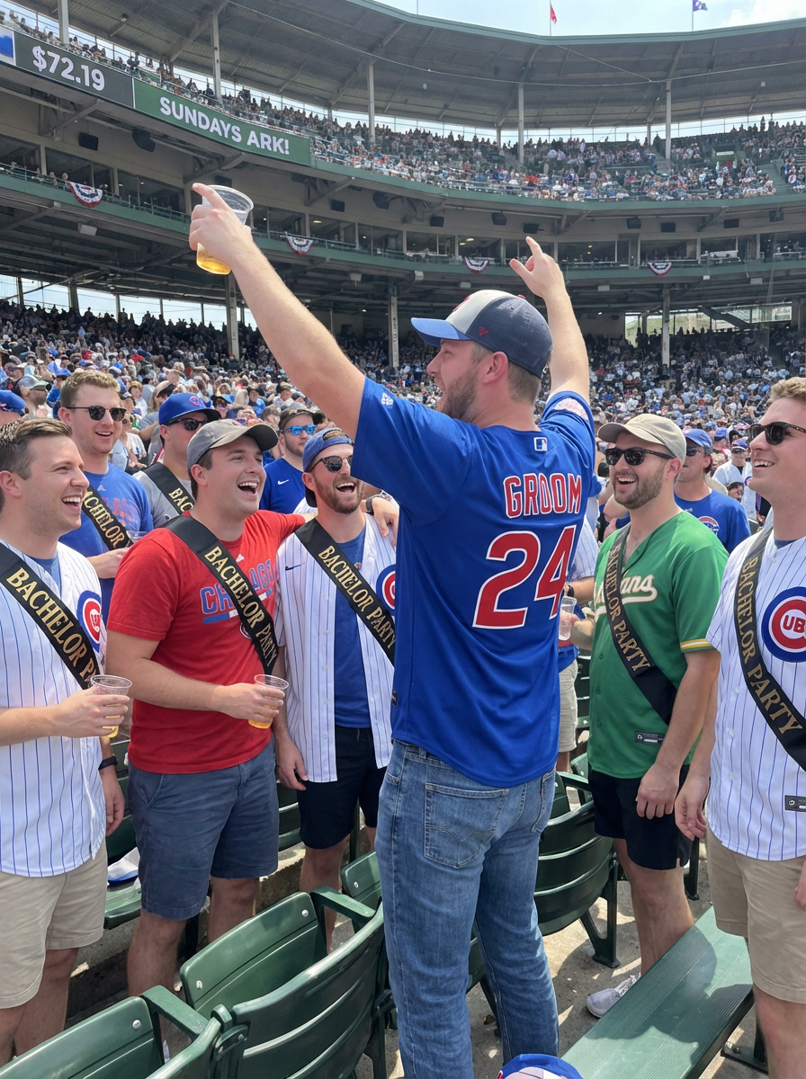 model at bachelor party sports event, stadium setting, team jersey or casual wear, cheering with friends