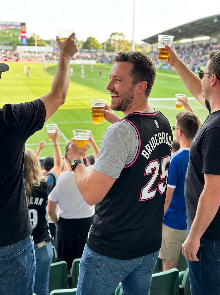 model at bachelor party sports event, stadium setting, team jersey or casual wear, cheering with friends