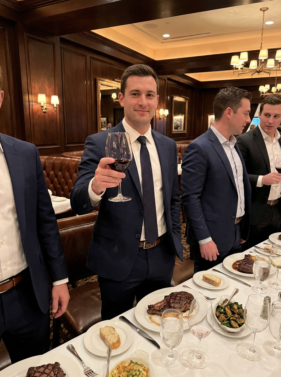 model at bachelor party steakhouse dinner, upscale restaurant, well-dressed, celebratory toast