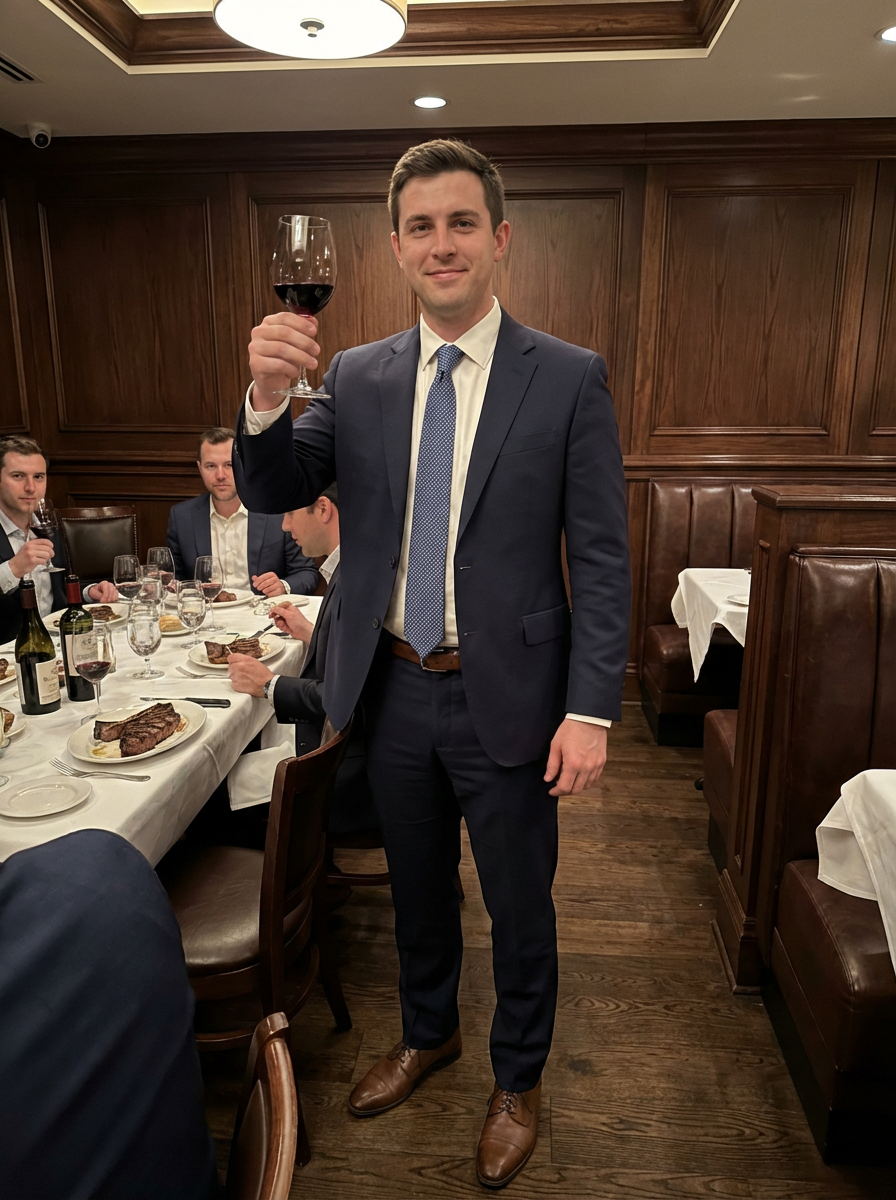 model at bachelor party steakhouse dinner, upscale restaurant, well-dressed, celebratory toast
