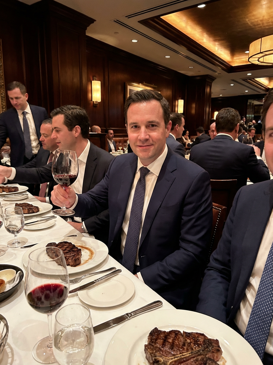 model at bachelor party steakhouse dinner, upscale restaurant, well-dressed, celebratory toast