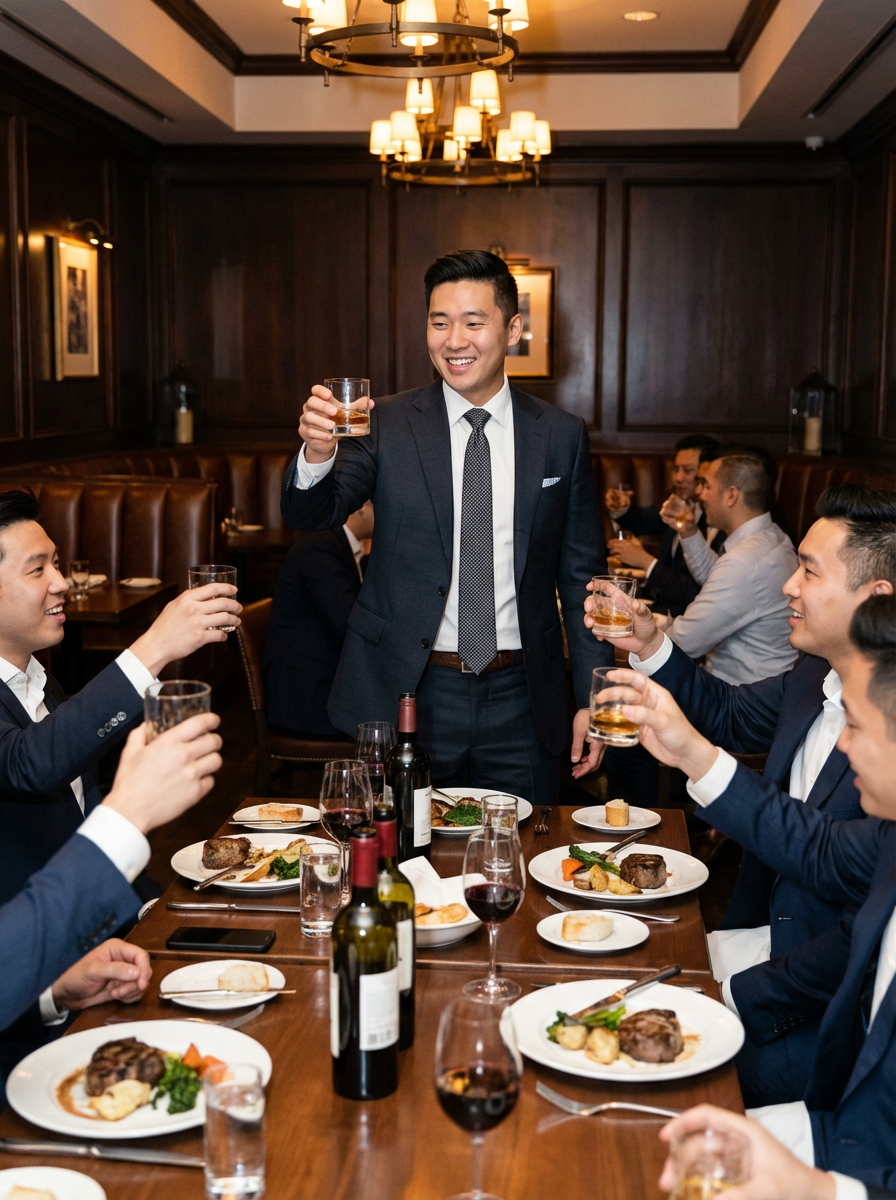 model at bachelor party steakhouse dinner, upscale restaurant, well-dressed, celebratory toast
