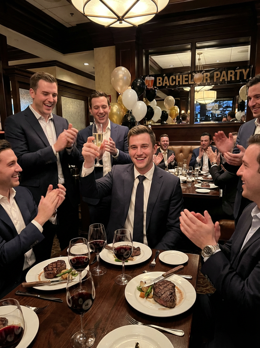 model at bachelor party steakhouse dinner, upscale restaurant, well-dressed, celebratory toast