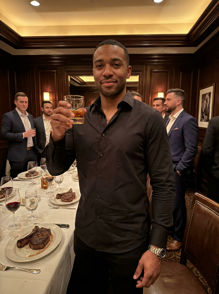 model at bachelor party steakhouse dinner, upscale restaurant, well-dressed, celebratory toast