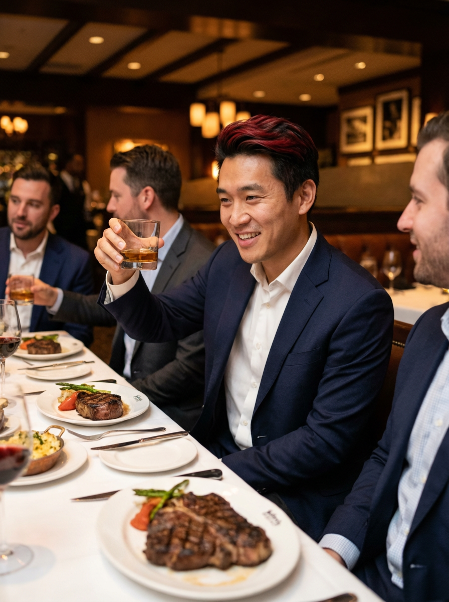 model at bachelor party steakhouse dinner, upscale restaurant, well-dressed, celebratory toast