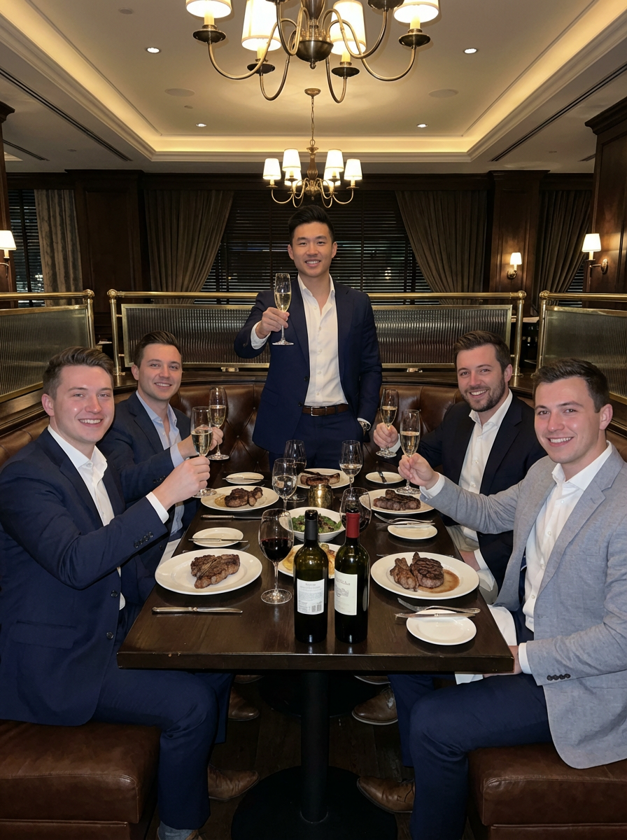 model at bachelor party steakhouse dinner, upscale restaurant, well-dressed, celebratory toast