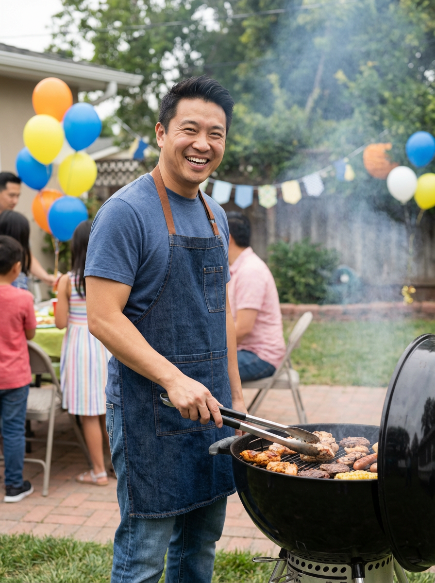 model at BBQ grill, Fathers Day cookout, grilling apron, backyard party setting, proud dad moment