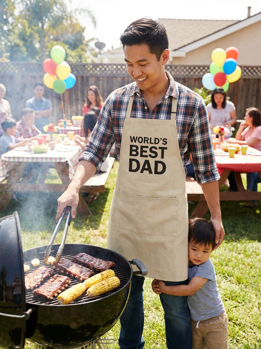 model at BBQ grill, Fathers Day cookout, grilling apron, backyard party setting, proud dad moment