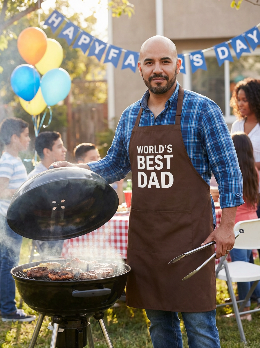 model at BBQ grill, Fathers Day cookout, grilling apron, backyard party setting, proud dad moment