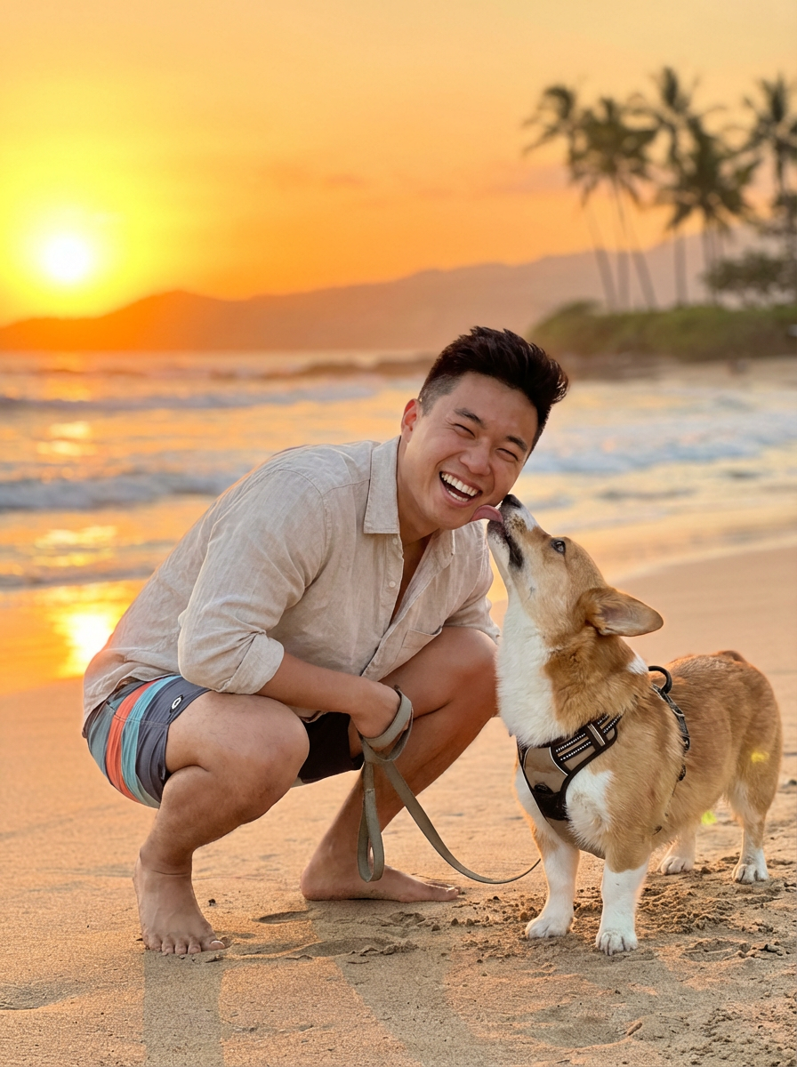 model at beach with playful corgi, sunset lighting, casual summer clothes, waves in background