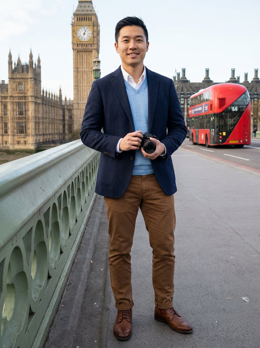 model at Big Ben and Westminster, iconic London backdrop, smart casual British style, classic tourist shot