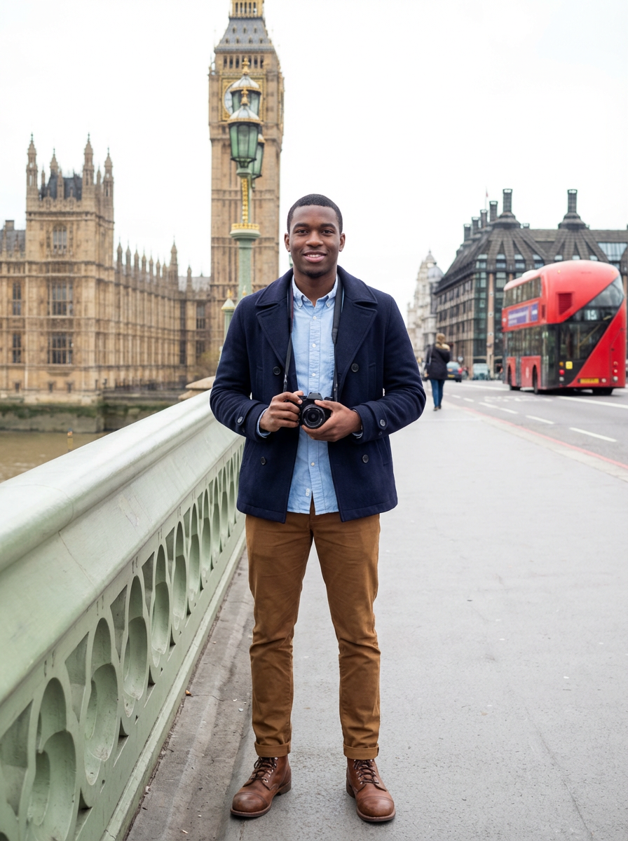 model at Big Ben and Westminster, iconic London backdrop, smart casual British style, classic tourist shot