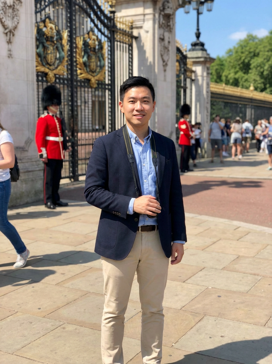 model at Buckingham Palace, royal guards visible, elegant tourist attire, sunny London day