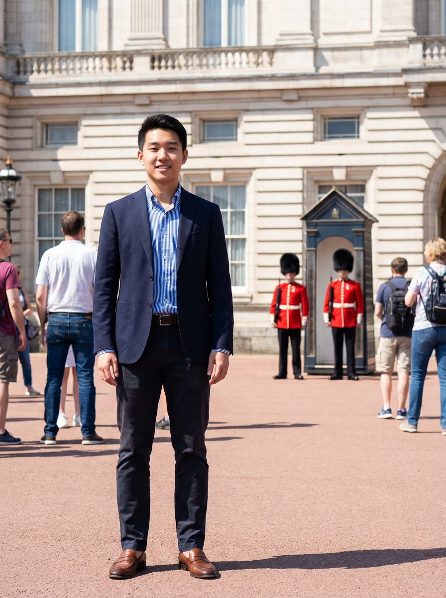 model at Buckingham Palace, royal guards visible, elegant tourist attire, sunny London day