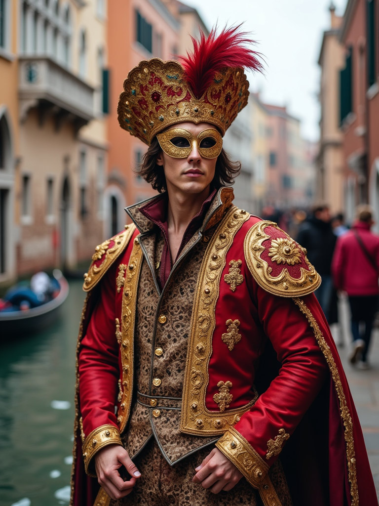 model at Carnival in Venice, wearing an elegant costume with European colors and gold mask, surrounded by historic architecture and canals, embodying European cultural tradition