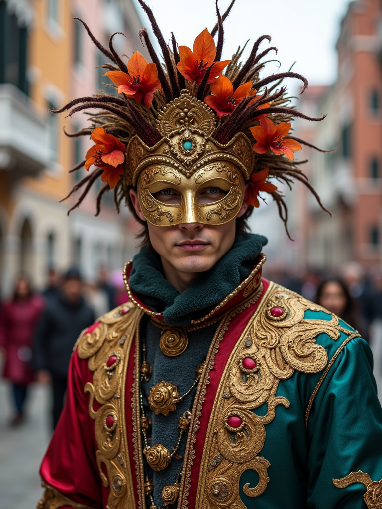 model at Carnival in Venice, wearing an elegant costume with European colors and gold mask, surrounded by historic architecture and canals, embodying European cultural tradition
