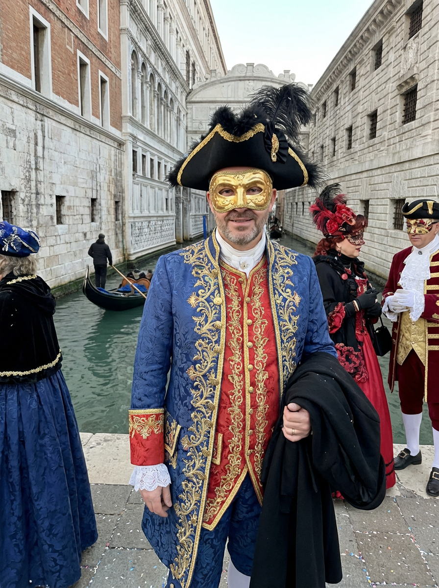 model at Carnival in Venice, wearing an elegant costume with European colors and gold mask, surrounded by historic architecture and canals, embodying European cultural tradition