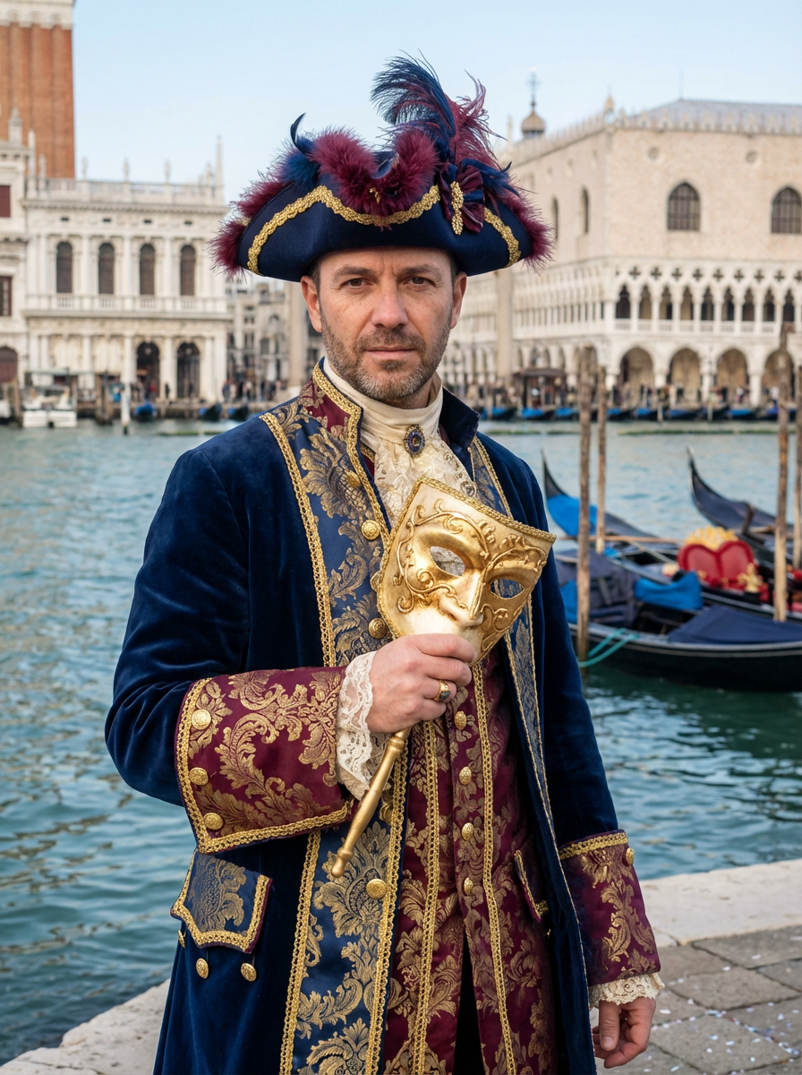 model at Carnival in Venice, wearing an elegant costume with European colors and gold mask, surrounded by historic architecture and canals, embodying European cultural tradition