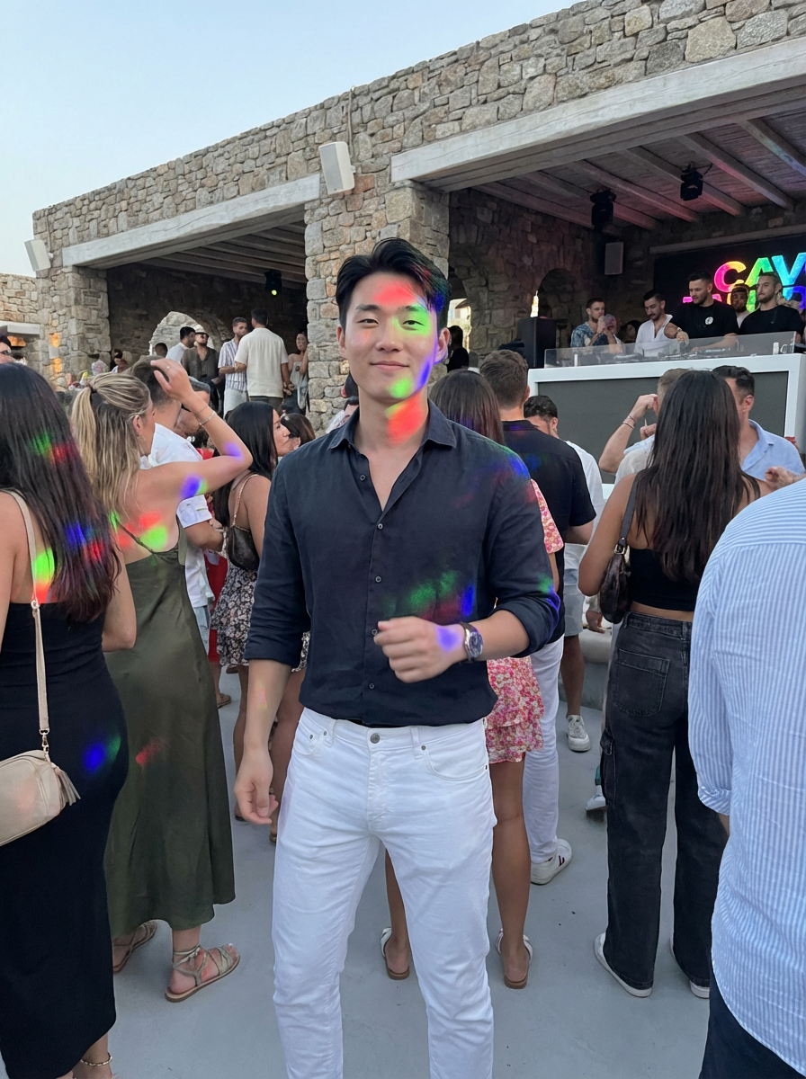 model at Cavo Paradiso nightclub, wearing white jeans with a stylish dark shirt, colorful lights and dancing atmosphere