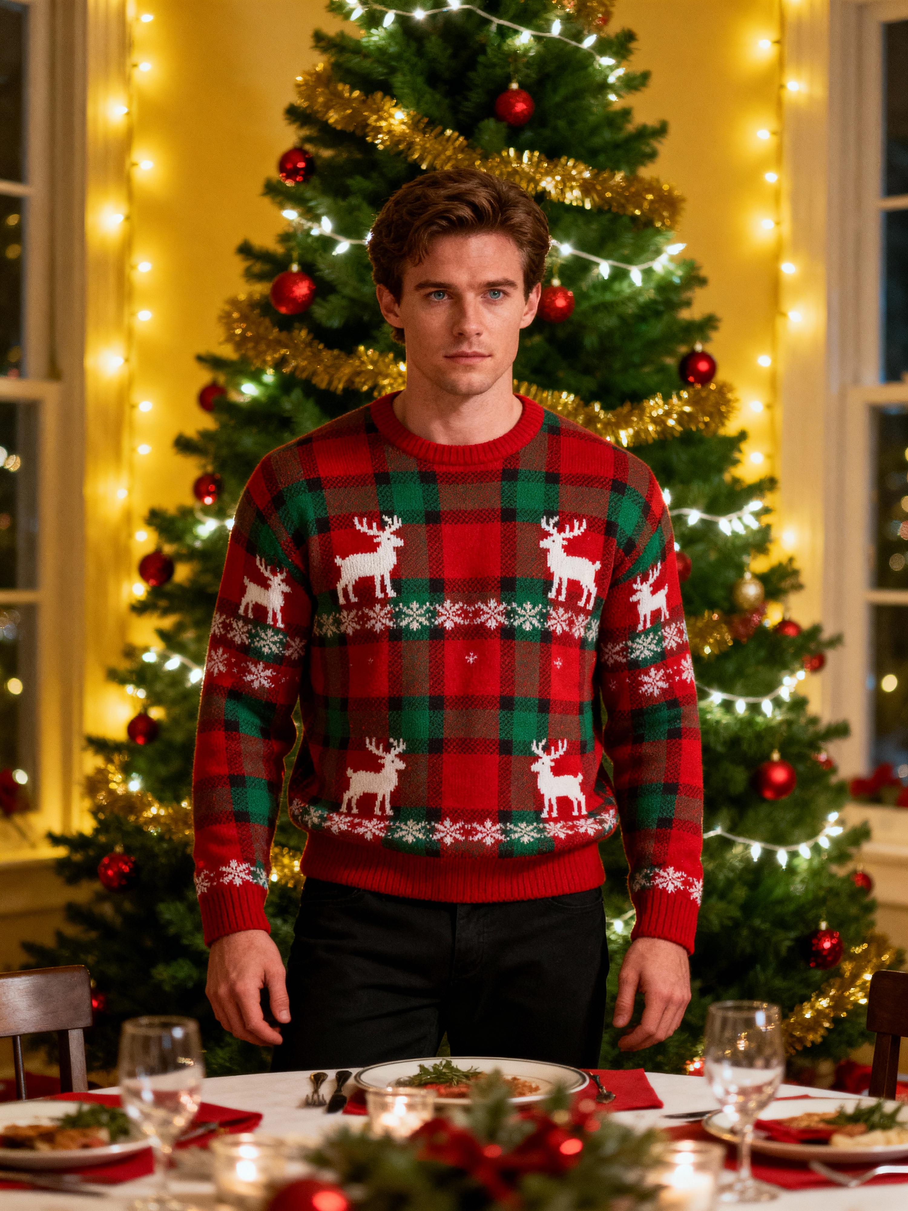 model at Christmas dinner wearing Christmas style clothes. Christmas tree in background. Christmas lights
