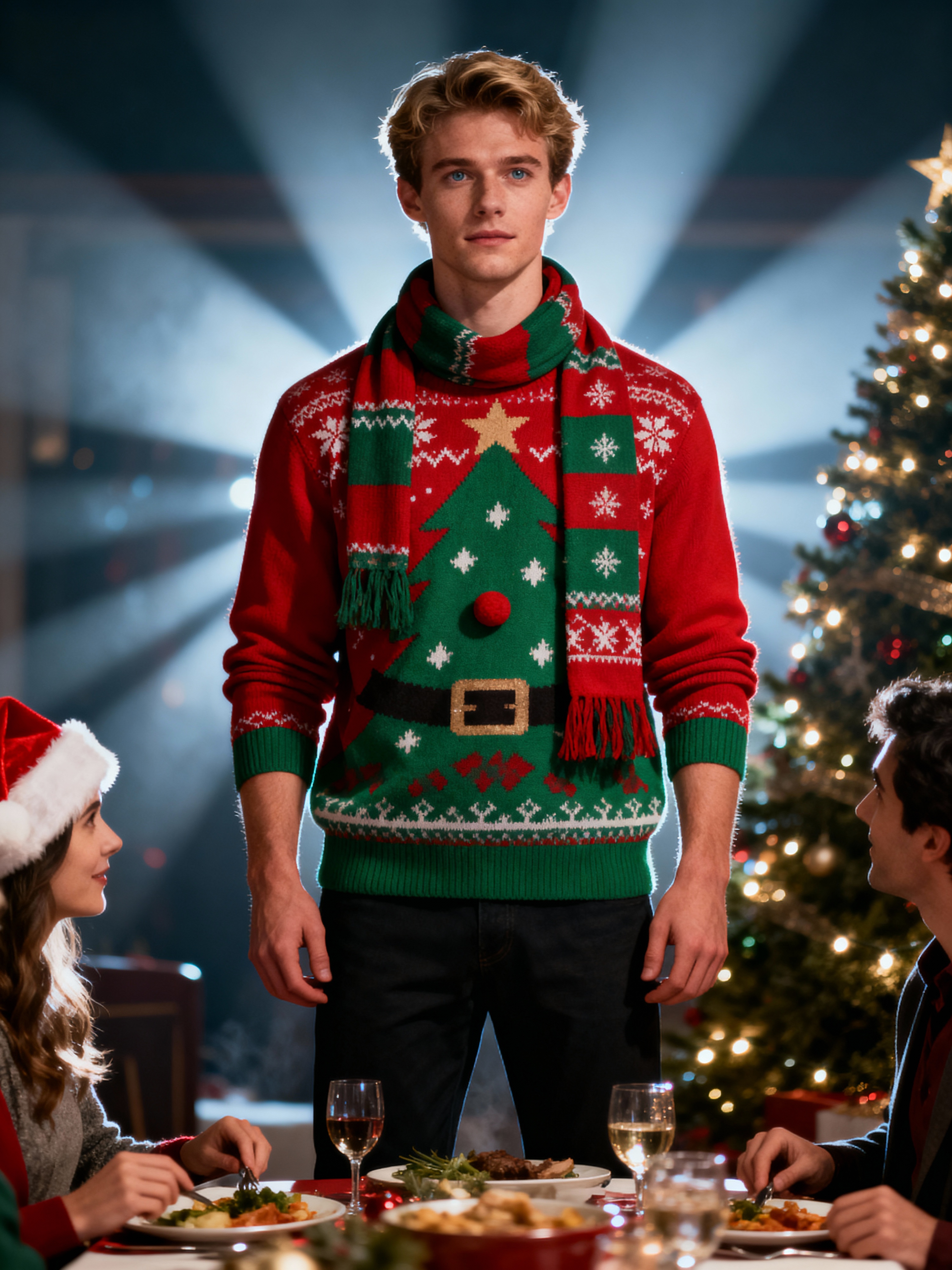 model at Christmas dinner wearing Christmas style clothes. Christmas tree in background. Christmas lights