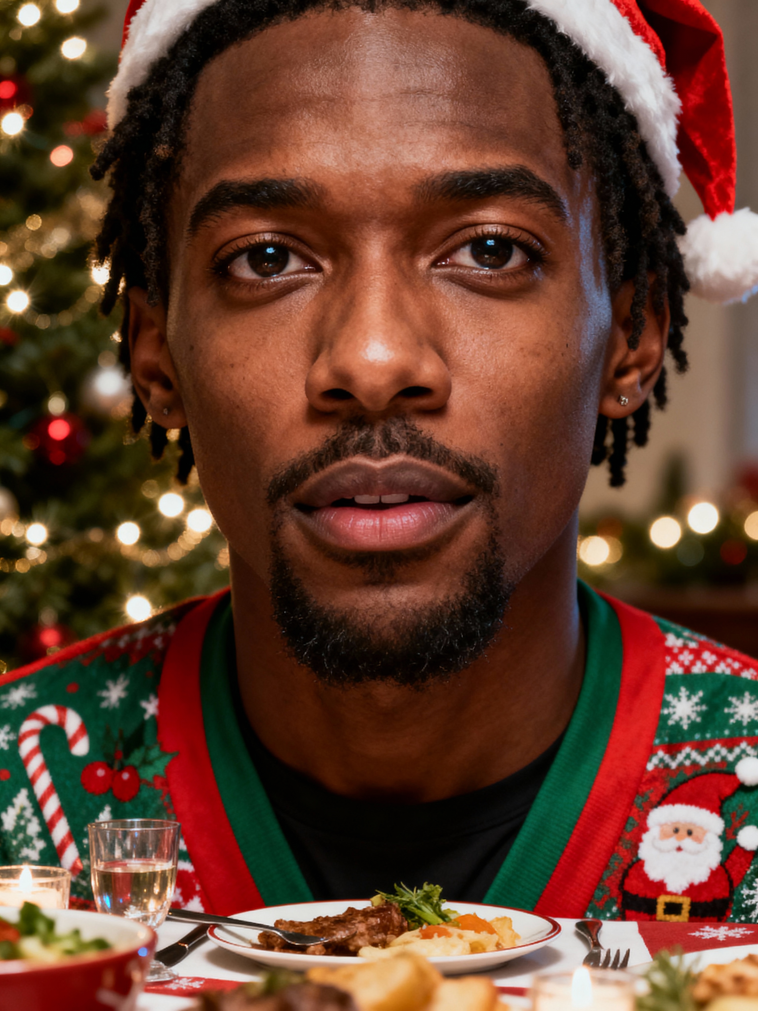 model at Christmas dinner wearing Christmas style clothes. Christmas tree in background. Christmas lights