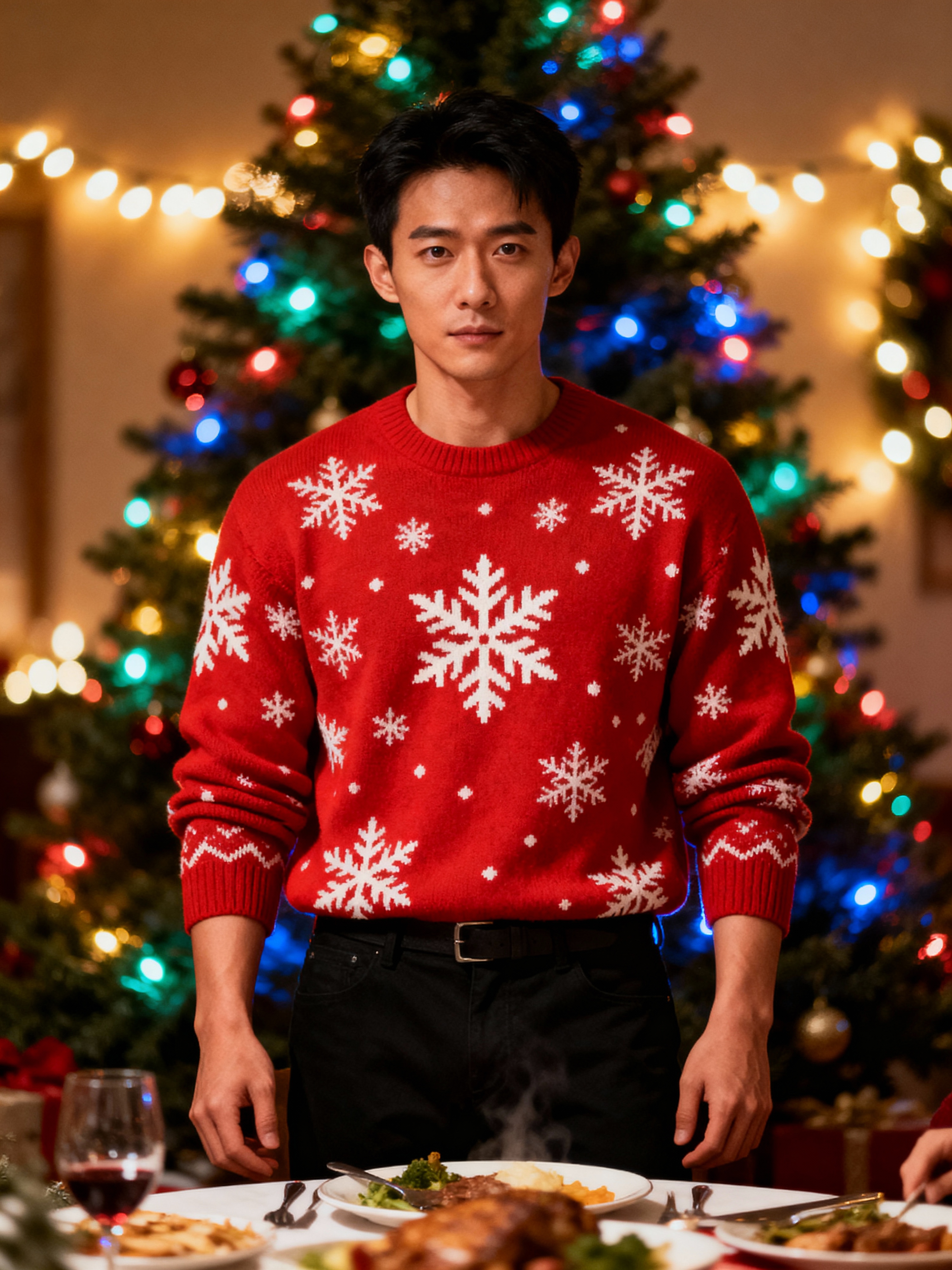model at Christmas dinner wearing Christmas style clothes. Christmas tree in background. Christmas lights