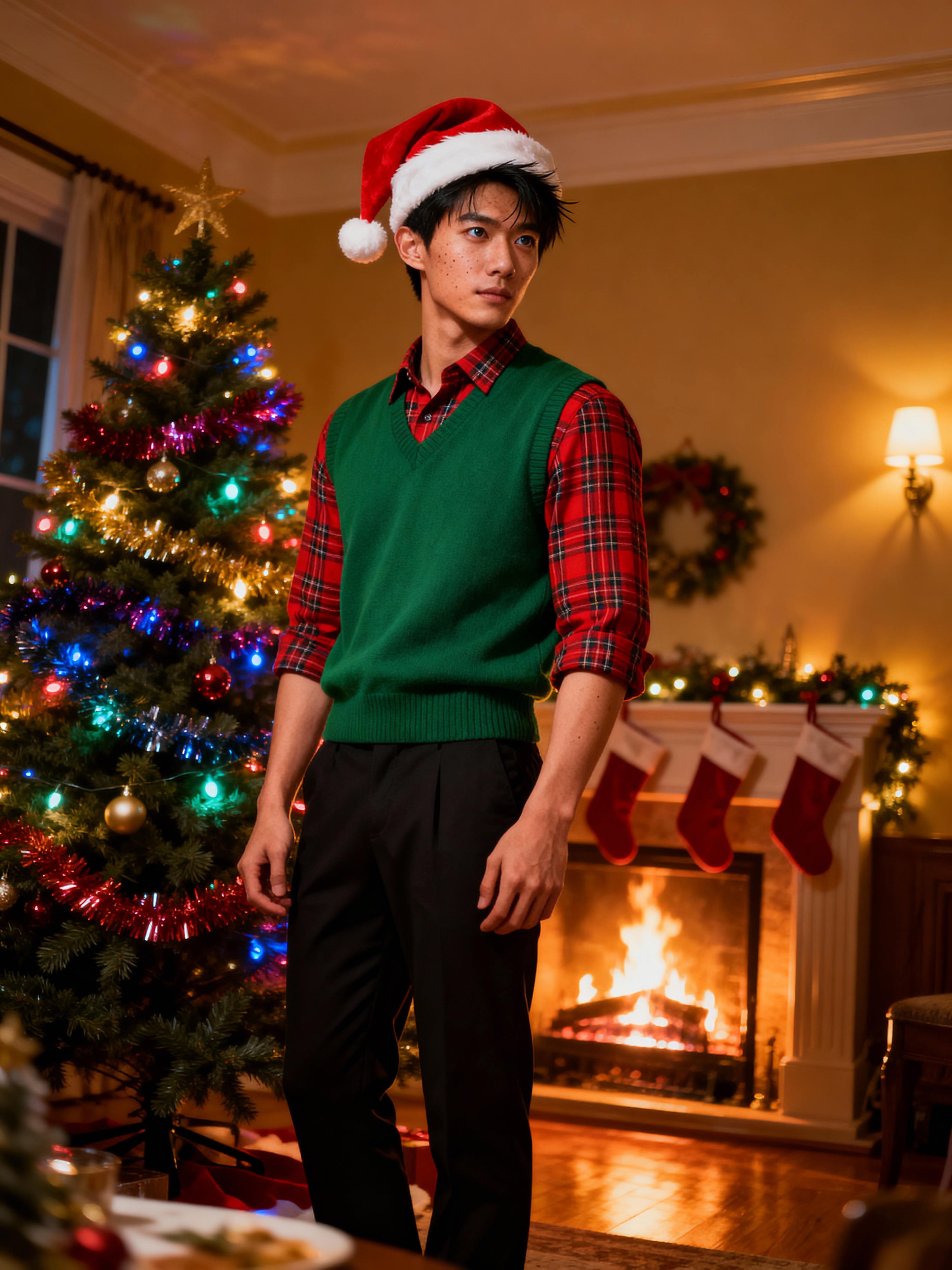 model at Christmas dinner wearing Christmas style clothes. Christmas tree in background. Christmas lights